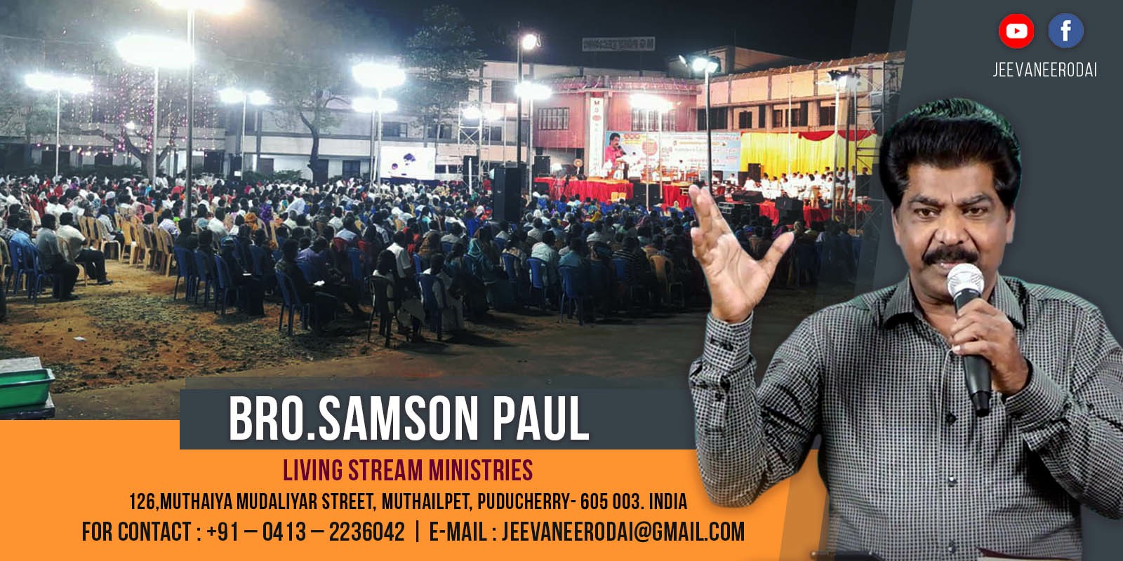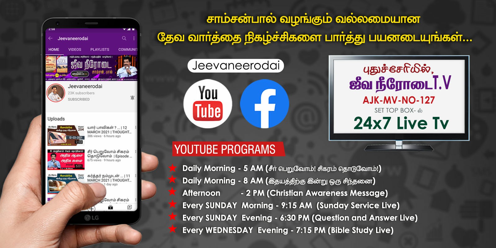 சாம்சன்பால் வழங்கும் அனைத்து தேவார்த்தை நிகழ்ச்சிகளை நேரலையில் YouTube and Facebook “jeevaneerodai” social media-வில் பார்த்து பயனடையுங்கள் | காலை 9.00 மணி | |