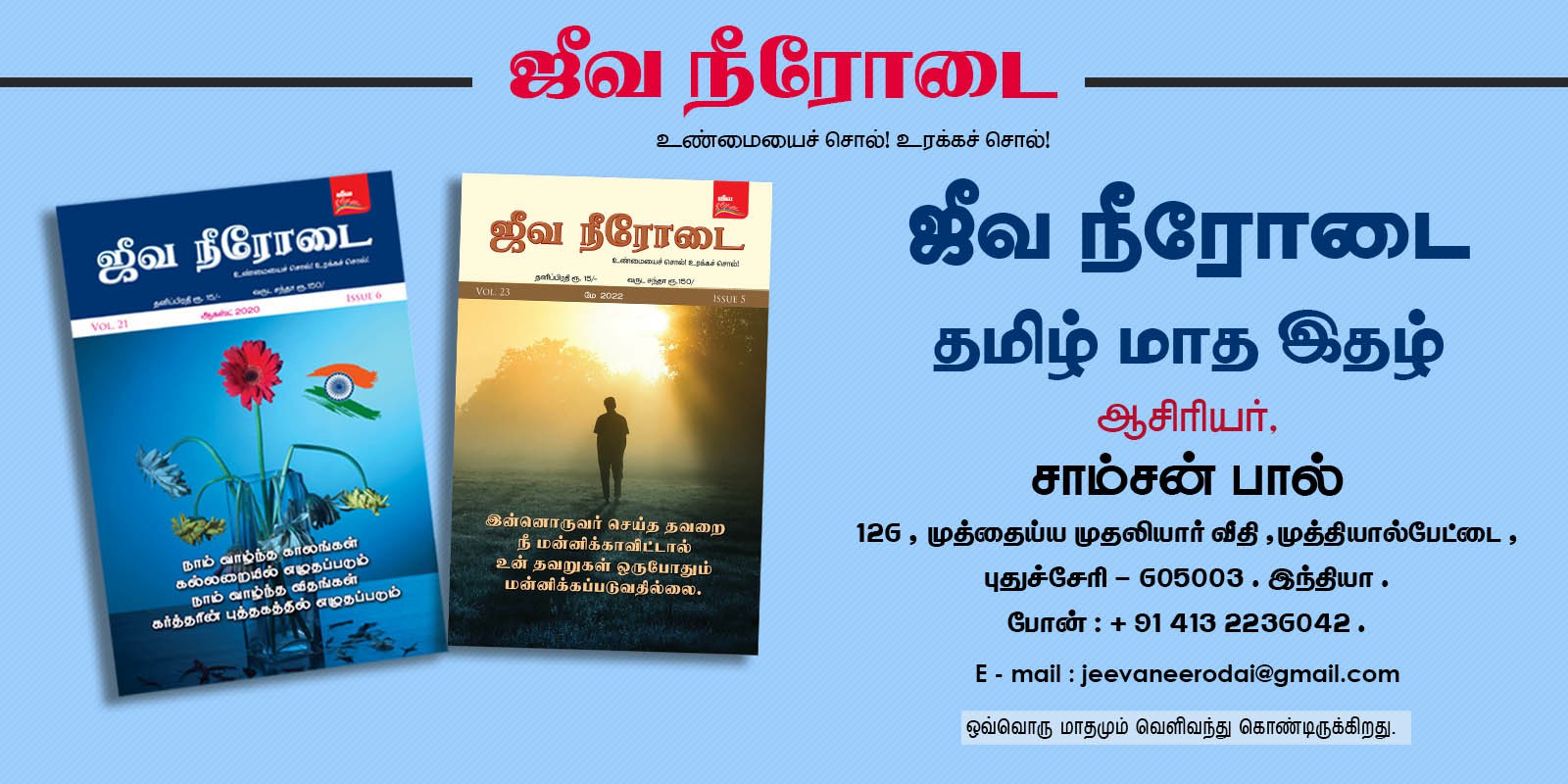 சாம்சன்பால் வழங்கும் அனைத்து தேவார்த்தை நிகழ்ச்சிகளை நேரலையில் YouTube and Facebook “jeevaneerodai” social media-வில் பார்த்து பயனடையுங்கள் | மாலை 7.00 மணி | |