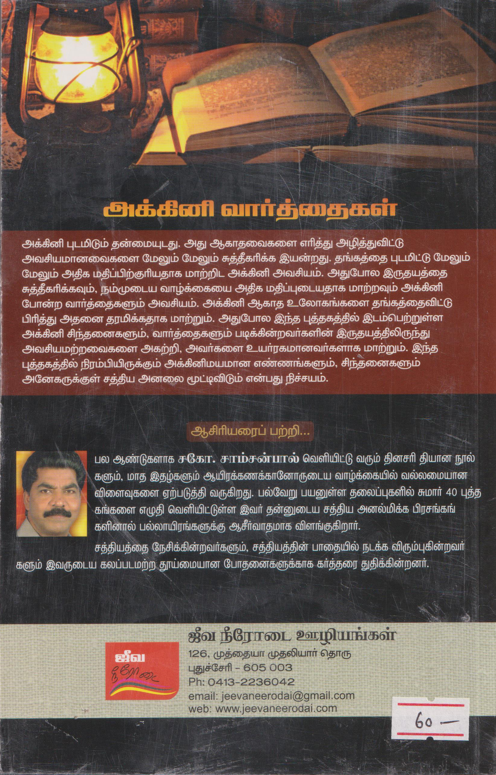 அக்கினி புடமிடும் தன்மையுடையது. அது ஆகாதவைகளை எரித்து அழித்துவிட்டு அவசியமானவைகளை மேலும் மேலும் சுத்தீகரிக்க இயன்றது. தங்கத்தை புடமிட்டு மேலும் மேலும் அதிக மதிப்பிற்குரியதாக மாற்றிட அக்கினி அவசியம். அதுபோல இருதயத்தை சுத்தீகரிக்கவும், நம்முடைய வாழ்க்கையை அதிக மதிப்புடையதாக மாற்றவும் அக்கினி போன்ற வார்த்தைகளும் அவசியம். அக்கினி ஆகாத உலோகங்களை தங்கத்தைவிட்டு பிரித்து அதனை தரமிக்கதாக மாற்றும். அதுபோல இந்த புத்தகத்தில் இடம் பெற்ற்றுள்ள அக்கினி சிந்தனைகளும், வார்த்தைகளும் படிக்கின்றவர்களின் இருதயத்திலிருந்து அவசியமற்றவைகளை அகற்றி, அவர்களை உயர்ரகமானவர்களாக மாற்றும். இந்த புத்தகத்தில் நிரம்பியிருக்கும் அக்கினிமயமான எண்ணங்களும், சிந்தனைகளும் அநேகருக்குள் சத்திய அனலை மூட்டிவிடும் என்பது நிச்சயம்.