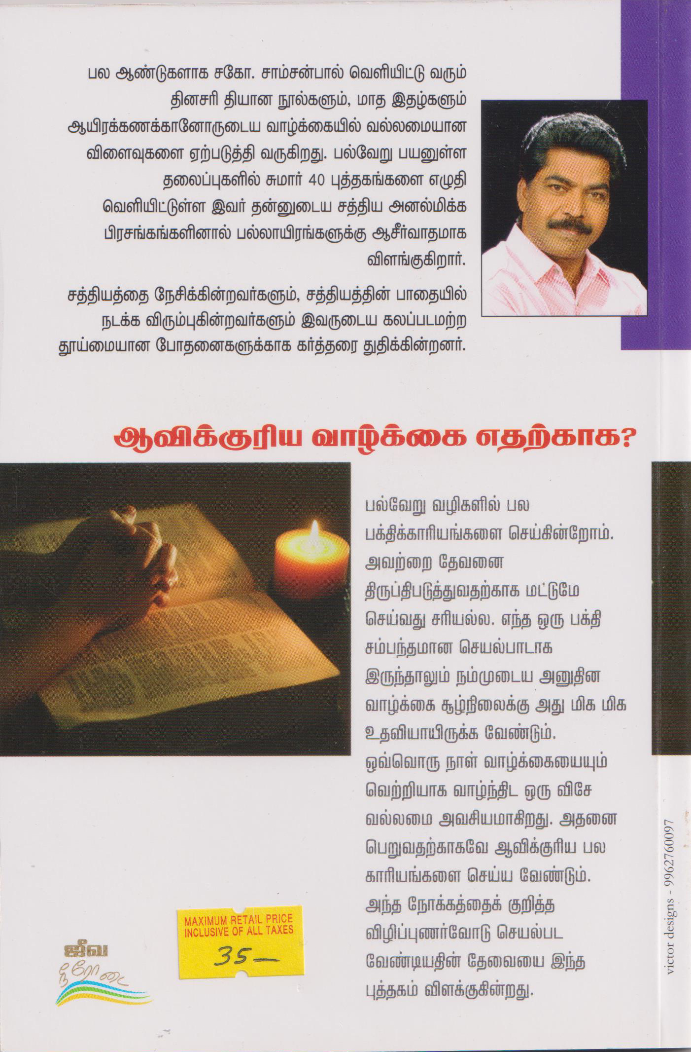 பல்வேறு வழிகளில் பல பக்திக்காரியங்களை செய்கின்றோம். அவற்றை தேவனை திருப்திபடுத்துவதற்காக மட்டுமே செய்வது சரியல்ல. எந்த ஒரு பக்தி சம்பந்தமான செயல்பாடாக இருந்தாலும் நம்முடைய அனுதின வாழ்க்கை சூழ்நிலைக்கு அது மிக மிக உதவியாயிருக்க வேண்டும். ஒவ்வொரு நாள் வாழ்க்கையையும் வெற்றியாக வாழ்ந்திட ஒரு விஷேச வல்லமை அவசியமாகிறது. அதனை பெறுவதற்காகவே ஆவிக்குரிய பல காரியங்களை செய்ய வேண்டும். அந்த நோக்கத்தை குறித்த விழிப்புணர்வோடு செயல்பட வேண்டியதின் தேவையை இந்த புத்தகம் விளக்குகின்றது.