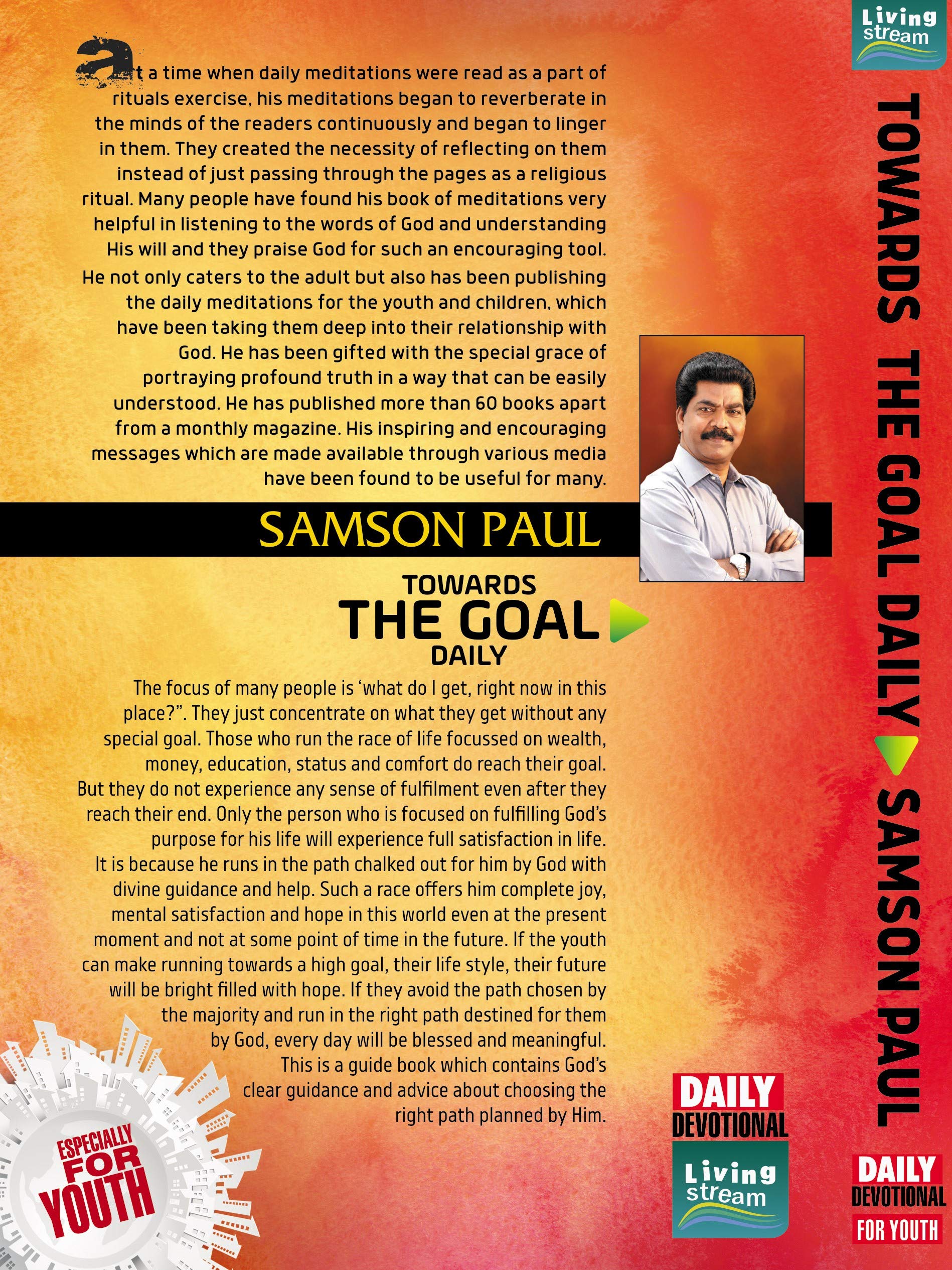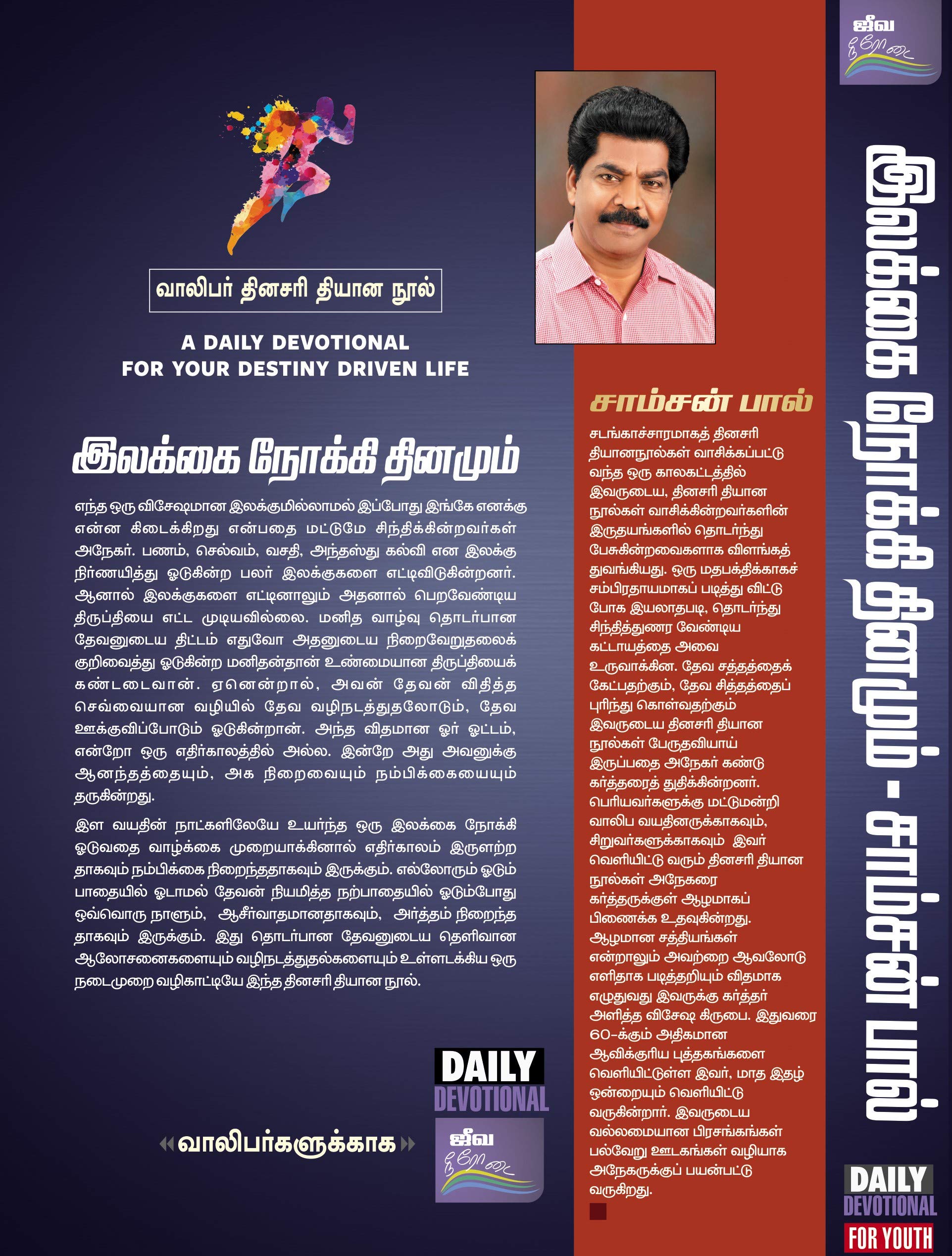 | எந்த ஒரு விஷேசமான இலக்குமில்லாமல் இப்போது இங்கே எனக்கு என்ன கிடைக்கிறது என்பதை மட்டுமே சிந்திக்கின்றவர்கள் அநேகர். பணம், செல்வம், வசதி, அந்தஸ்து கல்வி என இலக்கு நிர்ணயித்து ஓடுகின்ற பலர் இலக்குகளை எட்டி விடுகின்றனர். ஆனால் இலக்குகளை எட்டினாலும் அதனால் பெறவேண்டிய திருப்தியை எட்ட முடியவில்லை. மனித வாழ்வு தொடர்பான தேவனுடைய திட்டம் எதுவோ அதனுடைய நிறைவேறுதலைக் குறிவைத்து ஓடுகின்ற மனிதன்தான் உண்மையான திருப்தியைக் கண்டடைவான். ஏனென்றால், அவன் தேவன் விதித்த செவ்வையான வழியில் தேவ வழிநடத்துதலோடும், தேவ ஊக்கிவிப்போடும் ஓடுகின்றான். அந்த விதமான ஓர் ஓட்டம், என்றோ ஒரு எதிர்காலத்தில் அல்ல, இன்றே அது அவனுக்கு ஆனந்தத்தையும், அக நிறைவையும் நம்பிக்கையையும் தருகின்றது. இள வயதின் நாட்களிலேயே உயர்ந்த ஒரு இலக்கை நோக்கி ஓடுவதை வாழ்க்கை முறையாக்கினால் எதிகாலம் இருளற்றதாகவும், நம்பிக்கை நிறைந்ததாகவும் இருக்கும். எல்லோரும் ஓடும் பாதையில் ஓடாமல் தேவன் நியமித்த நற்பாதையில் ஓடும்போது ஒவ்வொரு நாளும், ஆசீர்வாதமானதாகவும், அர்த்தம் நிறைந்ததாகவும் இருக்கும். இது தொடர்பான தேவனுடைய தெளிவான ஆலோசனைகளையும் வழிநடத்துதல்களையும் உள்ளடக்கிய ஒரு நடைமுறை வழிகாட்டியே இந்த தினசரி தியான நூல் |