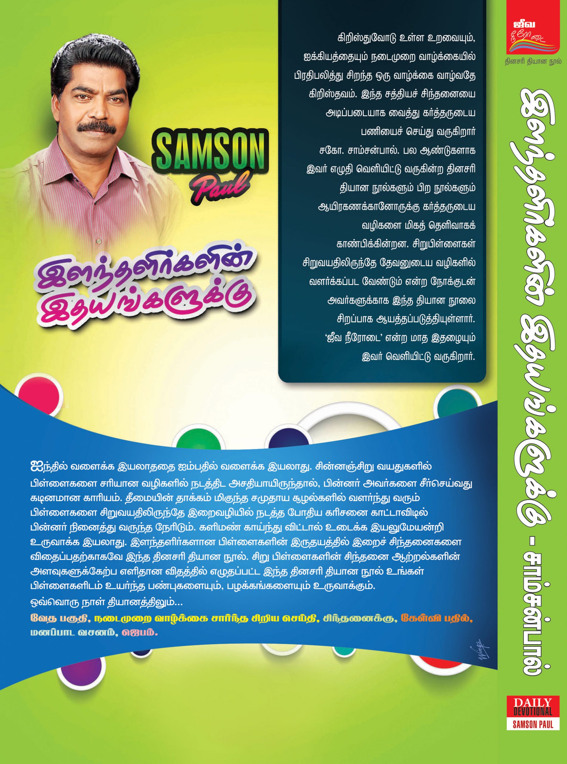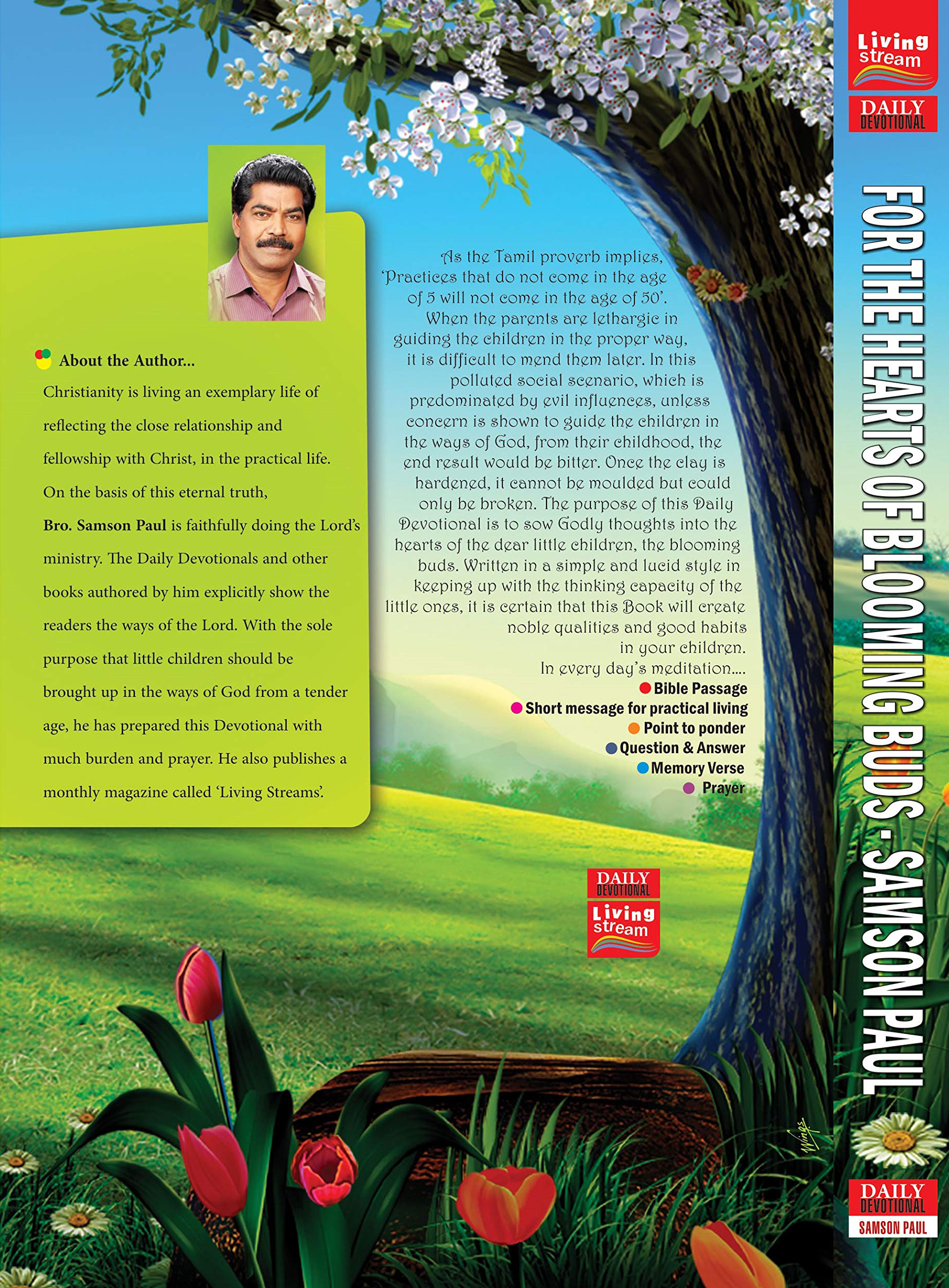 | ஐந்தில் வளைக்க இயலாததை ஐம்பதில் வளைக்க இயலாது. சின்னஞ்சிறு வயதுகளில் பிள்ளைகளை சரியான வழிகளில் நடத்திட அசதியாயிருந்தால், பின்னர் அவர்களை சீர்செய்வது கடினமான காரியம். தீமையின் தாக்கம் மிகுந்த சமுதாய சூழல்களில் வளர்ந்து வரும் பிள்ளைகளை சிறுவயதிலிருந்தே இறைவழிகளில் நடத்த போதிய கரிசனை காட்டாவிடில் பின்னர் நினைத்து வருந்த நேரிடும். களிமண் காய்ந்து விட்டால் உடைக்க இயலுமேயன்றி உருவாக்க இயலாது. இளந்தளிர்களான பிள்ளைகளின் இருதயத்தில் இறைச் சிந்தனைகளை விதைப்பதற்காகவே இந்த தினசரி தியான நூல். சிறு பிள்ளைகளின் சிந்தனை ஆற்றல்களின் அளவுகளுக்கேற்ப எளிதான விதத்தில் எழுதப்பட்ட இந்த தினசரி தியான நூல் உங்கள் பிள்ளைகளிடம் உயர்ந்த பண்புகளையும், பழக்கங்களையும் உருவாக்கும். ஒவ்வொரு நாள் தியானத்திலும்… வேத பகுதி, நடை முறை வாழ்க்கை சார்ந்த சிறிய செய்தி, சிந்தனைக்கு, கேள்வி பதில், மனப்பாட வசனம், ஜெபம். |