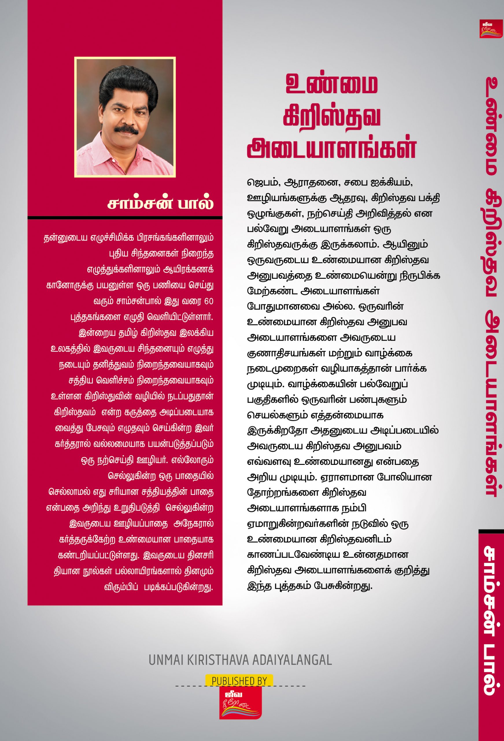 ஜெபம் , ஆராதனை,சபை ஐக்கியம் , ஊழியங்களுக்குஆதரவு, கிறிஸ்துவபக்திஒழுங்குகள் , நற்செய்திஅறிவித்தல்என பல்வேறுஅடையாளங்கள்ஒருகிறிஸ்தவருக்குஇருக்கலாம். ஆயினும்ஒருவருடையஉண்மையான கிறிஸ்துவஅனுபவத்தைஉண்மையென்றுநிருபிக்க மேற்கொண்ட அடையாளங்கள்போதுமானவைஅல்ல. ஒருவரின் உண்மையான கிறிஸ்தவஅனுபவஅடையாளங்களைஅவருடையகுணாதிசயங்கள்மற்றும்வாழ்க்கைநடைமுறைகள்வழியாகத்தான்பார்க்கமுடியும். வாழ்க்கையின் பல்வேறுபகுதிகளில்ஒருவரின் பண்புகளும்செயல்களும் எத்தன்மையாகஇருக்கிறதோஅதனோடியஅடிப்படியில்அவருடையகிறிஸ்தவஅனுபவம்எவ்வளவுஉண்மனையானதுஎன்பதை அறியமுடியும் . ஏராளமான போலியானதோற்றங்களைகிறிஸ்தவஅடையாளங்களாகநம்பிஏமாறுகின்றவர்களின்நடுவில்ஒருஉண்மையானகிறிஸ்தவனிடம்காணப்படவேண்டியஉன்னதமான கிறிஸ்தவஅடையாளங்களைக்குறித்து இந்தபுத்தகம்பேசுகின்றது.