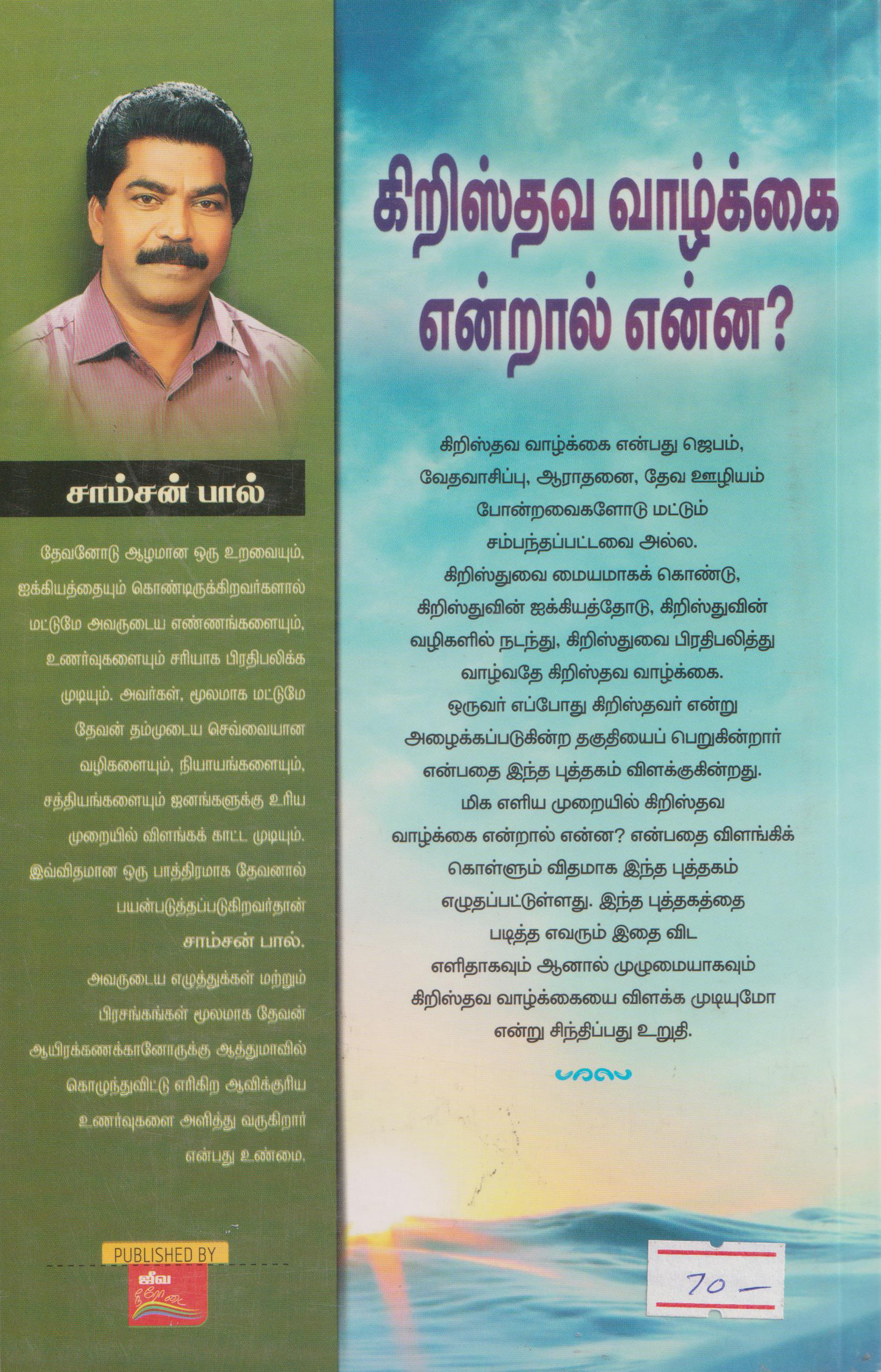 கிறிஸ்தவ வாழ்க்கை என்பது ஜெபம், வேதவாசிப்பு, ஆராதனை, தேவ ஊழியம் போன்றவைகளோடு மட்டும் சம்பந்தப்பட்டவை அல்ல. கிறிஸ்துவை மையமாகக் கொண்டு, கிறித்ஸ்துவின் ஐக்கியத்தோடு, கிறிஸ்துவின் வழிகளில் நடந்து, கிறிஸ்துவை பிரதிபலித்து வாழ்வதே கிறிஸ்தவ வாழ்க்கை. ஒருவர் எப்போது கிறிஸ்தவர் என்று அழைக்கப்படுகின்ற தகுதியைப் பெறுகின்றார் என்பதை இந்த புத்தகம் விளக்குகின்றது. மிக எளிய முறையில் கிறிஸ்தவ வாழ்க்கை என்றால் என்ன? என்பதை விளங்கிக்கொள்ளும் விதமாக இந்த புத்தகம் எழுதப்பட்டுள்ளது. இந்த புத்தகத்தை படித்த எவரும் இதை விட எளிதாகவும் ஆனால் முழுமையாகவும் கிறிஸ்தவ வாழ்க்கையை விளக்க முடியுமோ என்று சிந்திப்பது உறுதி.