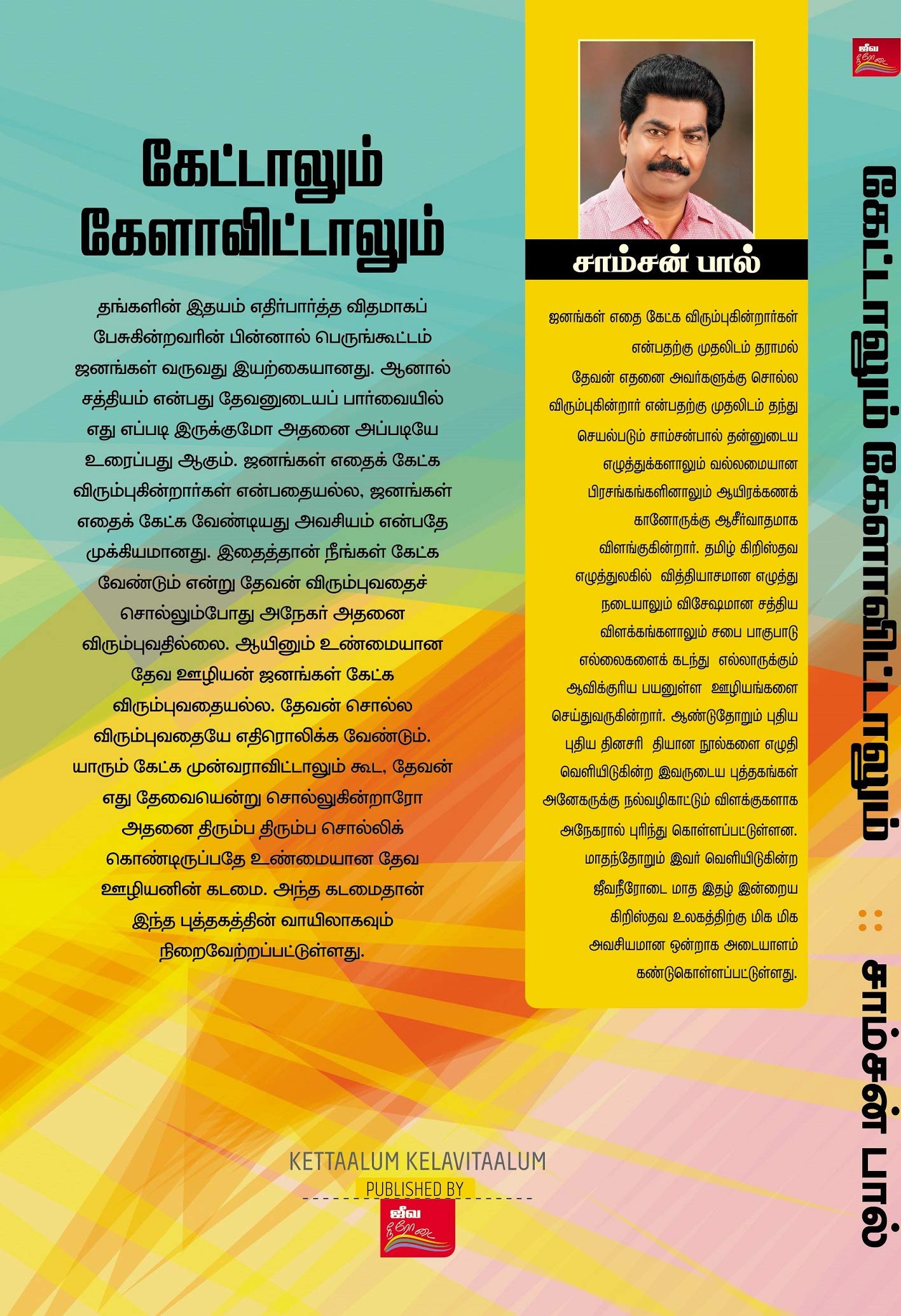 தங்களின் இதயம் எதிர்பார்த்த விதமாகப் பேசுகின்றவரின் பின்னால் பெருங்கூட்டம் ஜனங்கள் வருவது இயற்கையானது. ஆனால் சத்தியம் என்பது தேவனுடையப் பார்வையில் எது எப்படி இருக்குமோ அதனை அப்படியே உரைப்பது ஆகும. ஜனங்கள் எதைக் கேட்க விரும்புகின்றார்கள் என்பதையல்ல, ஜனங்கள் எதைக் கேட்க வேண்டியது அவசியம் என்பதே முக்கியமானது. இதைத்தான் நீங்கள் கேட்க வேண்டும் என்ற தேவன் விரும்புவதைச் சொல்லும்போது அநேகர் அதனை விரும்புவதில்லை. ஆயினும் உண்மையான தேவ ஊழியன் ஜனங்கள் கேட்க விரும்புவதையல்ல. தேவன் சொல்ல விரும்புவதையே எதிரொலிக்க வேண்டும். யாரும் கேட்க முன்வராவிட்டாலும் கூட, தேவன் எது தேவையென்று சொல்லுகின்றாரோ அதனை திரும்ப திரும்ப சொல்லிக் கொண்டிருப்பதே உண்மையான தேவ ஊழியனின் கடமை. அந்த கடமைதான் இந்த புத்தகத்தின் வாயிலாகவும் நிறைவேற்றப்பட்டுள்ளது.