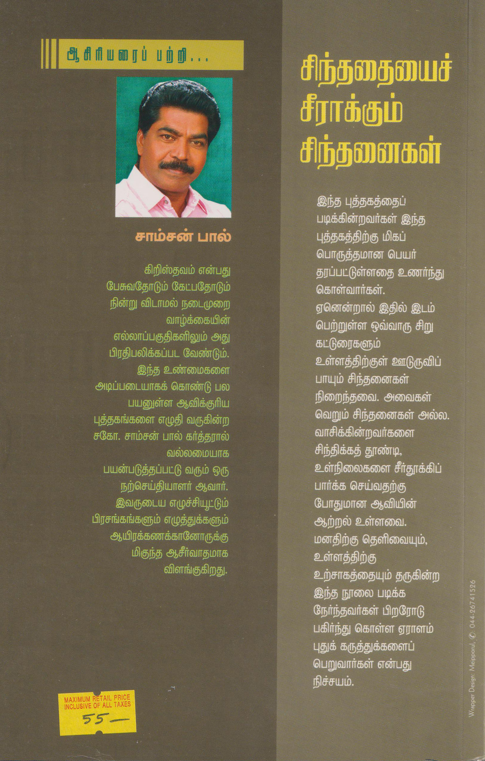 இந்த புத்தகத்தை படிக்கின்றவர்கள் இந்த புத்தகத்திற்கு மிகப் பொருத்தமான தலைப்பு தரப்பட்டுள்ளதை உணர்ந்து கொள்வார்கள். ஏனென்றால் இடம் பெற்றுள்ள ஒவ்வொரு சிறு கட்டுரைகளும் உள்ளத்திற்குள் ஊடுருவிப் பாயும் சிந்தனைகள் நிறைந்தவை. அவைகள் வெறும் சிந்தனைகள் அல்ல. வாசிக்கின்றவர்களை சிந்திக்கத் தூண்டி, உள்நிலைகளை சீர்தூக்கிப் பார்க்க செய்வதற்கு போதுமான ஆவியின் ஆற்றல் உள்ளவை. மனதிற்கு தெளிவையும், உள்ளத்திற்கு உற்சாகத்தையும் தருகின்ற இந்த நூலை படிக்க நேர்ந்தவர்கள் பிறரோடு பகிர்ந்து கொள்ள ஏராளம் புதுக் கருத்துக்களைப் பெறுவார்கள் என்பது நிச்சயம்.