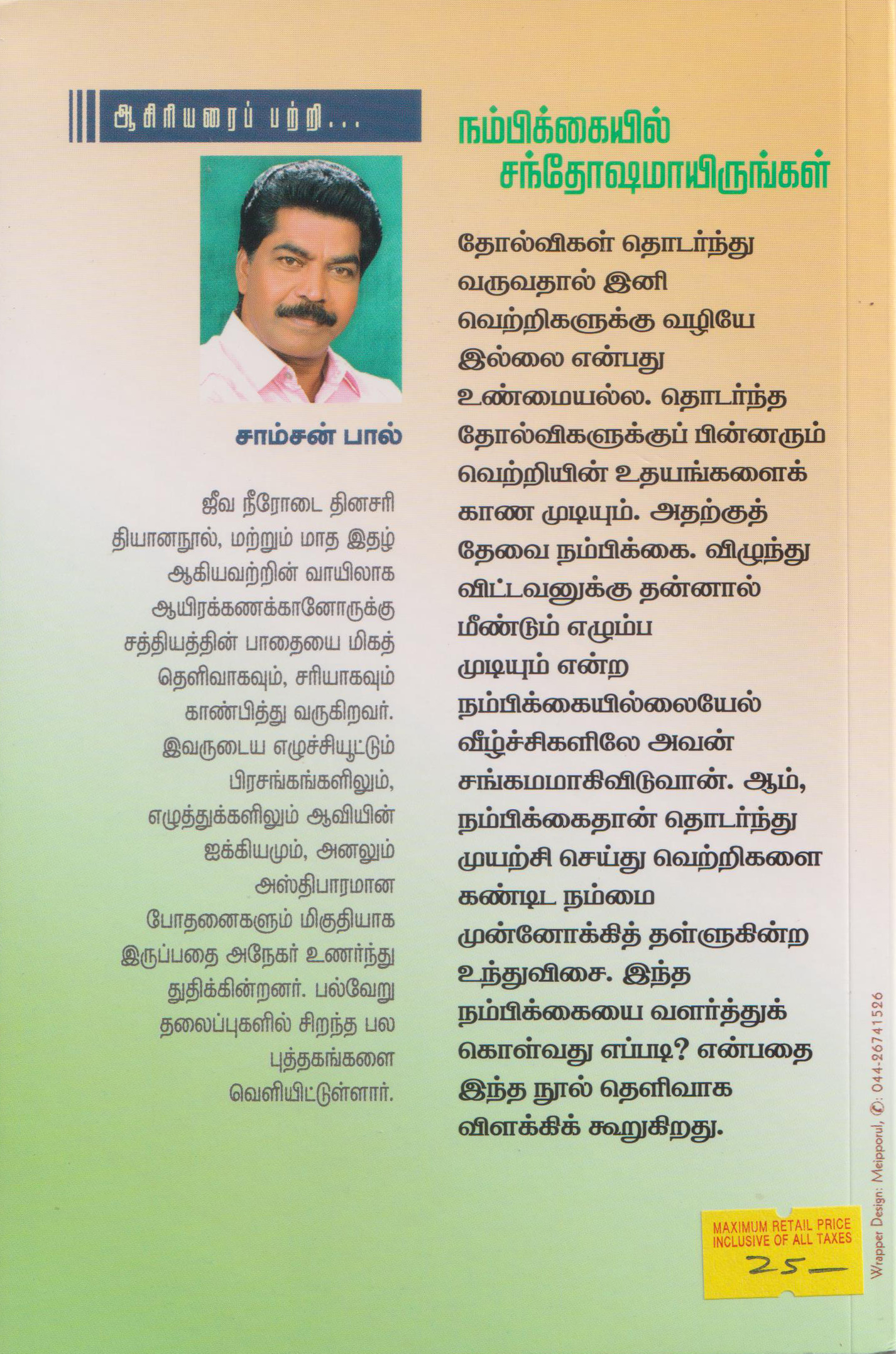 தோல்விகள் தொடர்ந்து வருவதால் இனி வெற்றிகளுக்கு வழியே இல்லை என்பது உண்மையல்ல. தொடர்ந்த தோல்விகளுக்குப் பின்னரும் வெற்றியின் உதயங்களைக் காண முடியும். அதற்குத் தேவை நம்பிக்கை. விழுந்து விட்டவனுக்கு தன்னால் மீண்டும் எழும்ப முடியும் என்ற நம்பிக்கையில்லையேல் வீழ்ச்சிகளிலே அவன் சங்கமமாகிவிடுவான். ஆம், நம்பிக்கைதான் தொடர்ந்து முயற்சி செய்து வெற்றிகளை கண்டிட நம்மை முன்னோக்கித் தள்ளுகின்ற உந்துவிசை. இந்த நம்பிக்கையை வளர்த்துக் கொள்வது எப்படி? என்பதை இந்த நூல் தெளிவாக விளக்கிக் கூறுகிறது.