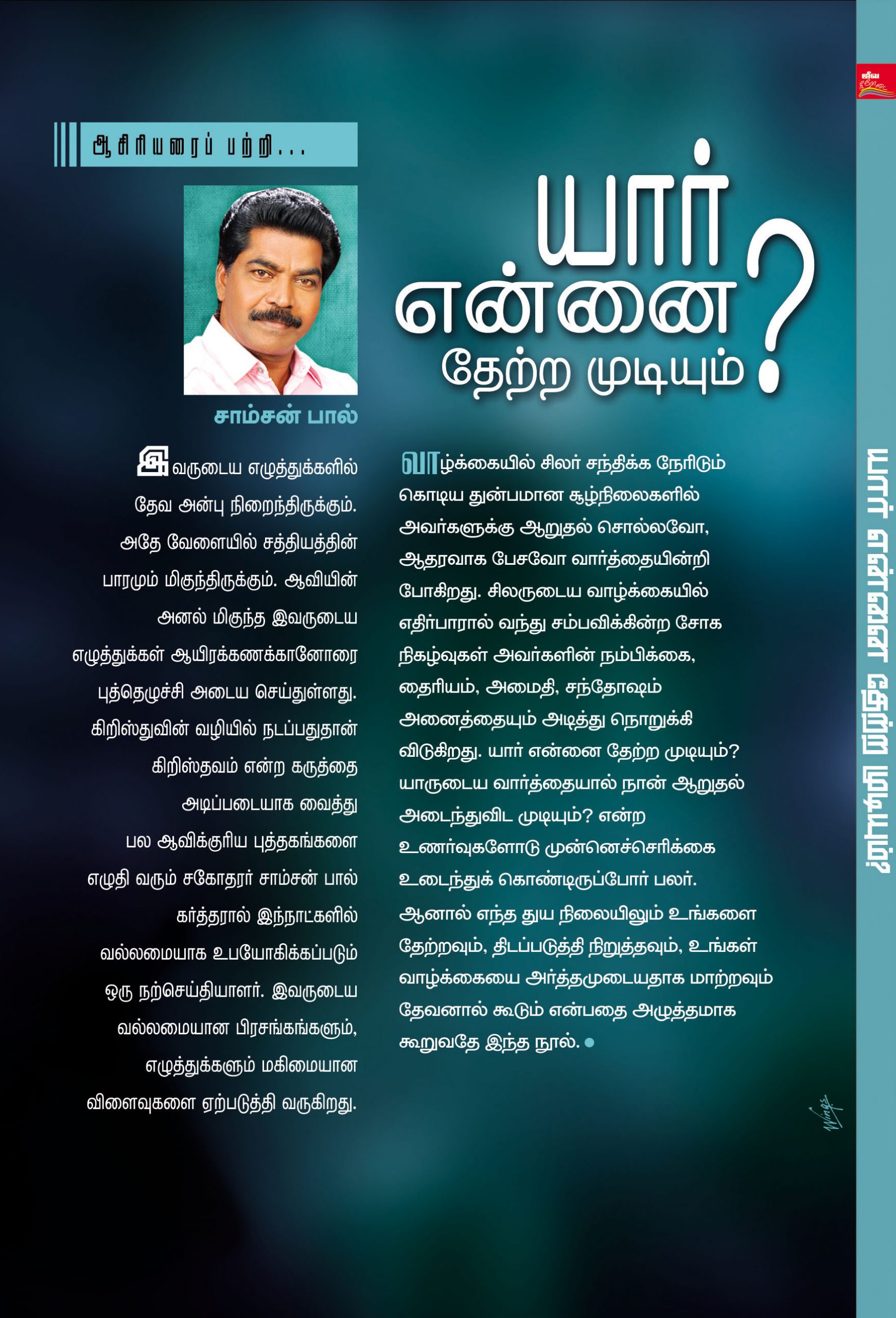 வாழ்க்கையில் மிகத் துன்பமான சூழ்நிலைகளைக் காண நேர்ந்து நொறுங்கிப்போன மன நிலையில் இருப்பவர்களை ஆறுதல்படுத்துவது என்பது அரிதானக் காரியம். ஆயினும் எந்த ஒரு சூழ்நிலையிலும் ஒருவரை ஆறுதல் படுத்தவும்,அவரைத் தாங்கி நடத்தவும் கர்த்தர் போதுமானவர் என்பதை இந்த புத்தகம் தெளிவாக விளக்குகிறது. ஆயிரக்கணக்கானோருடைய வாழ்க்கையில் இந்த புத்தகம் கர்த்தருடைய ஆறுதலைக் கொண்டுவருகிறது.