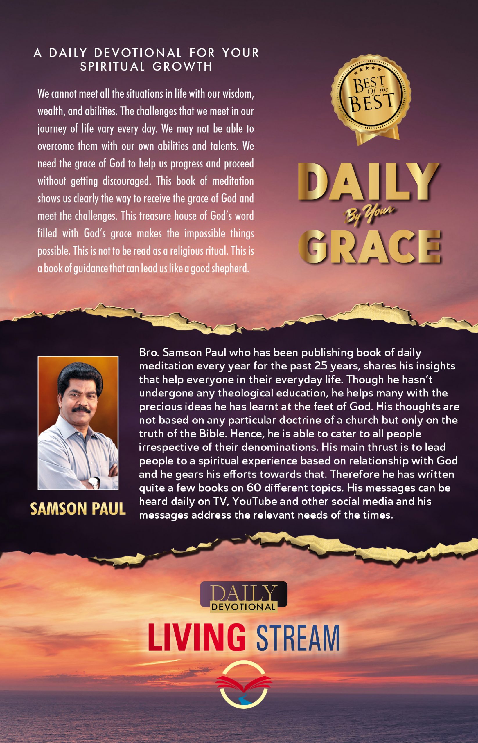 Bro. Samson Paul who has been publishing book of daily meditation every year for the past 25 years, shares his insights that help everyone in their everyday life. Though he hasn’t undergone any theological education, he helps many with the precious ideas he has learnt at the feet of God. His thoughts are not based on any particular doctrine of a church but only on the truth of the Bible. Hence, he is able to cater to all people irrespective of their denominations. His main thrust is to lead people to a spiritual experience based on relationship with God and he gears his efforts towards that. Therefore he has written quite a few books on 60 different topics. His messages can be heard daily on TV, YouTube and other social media and his messages address the relevant needs of the times.
